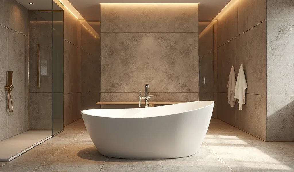 Eine freistehende Badewanne wird zum zentralen Highlight des Badezimmers und schafft ein exklusives Spa-Gefühl. Sie verbindet elegantes Design mit höchstem Komfort und lädt zum entspannten Abschalten ein.
